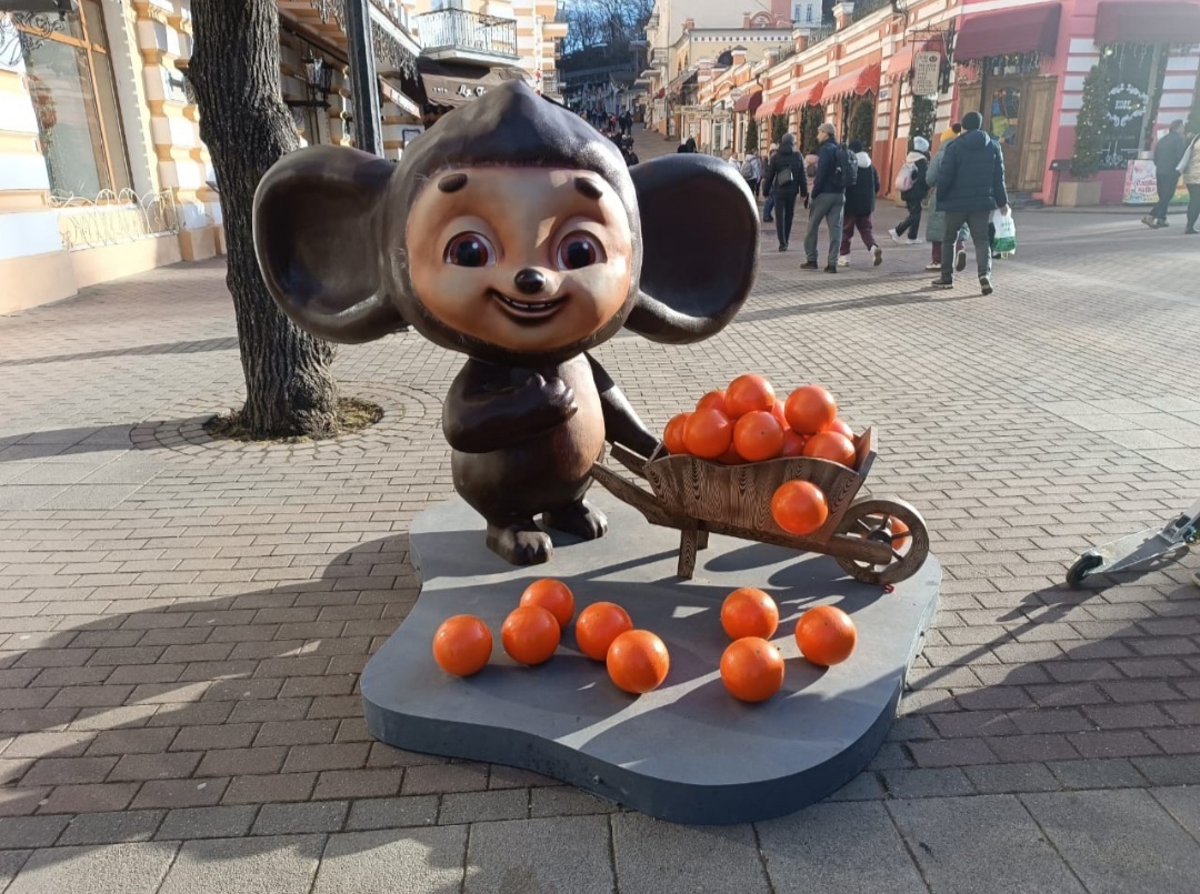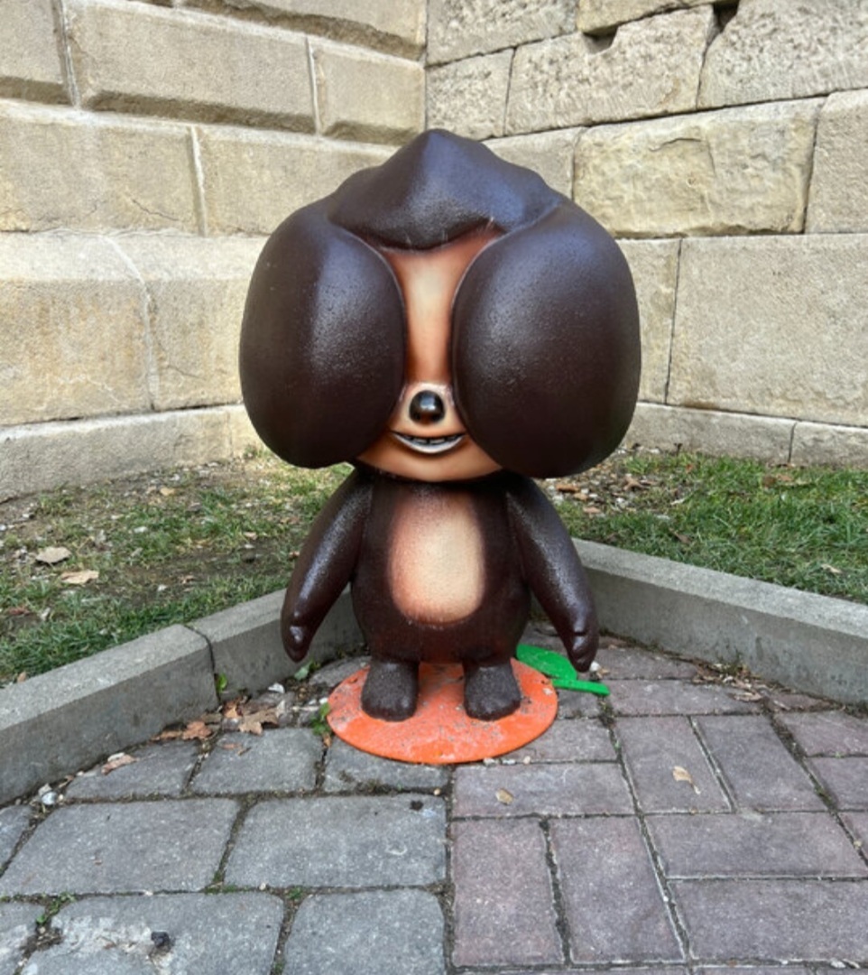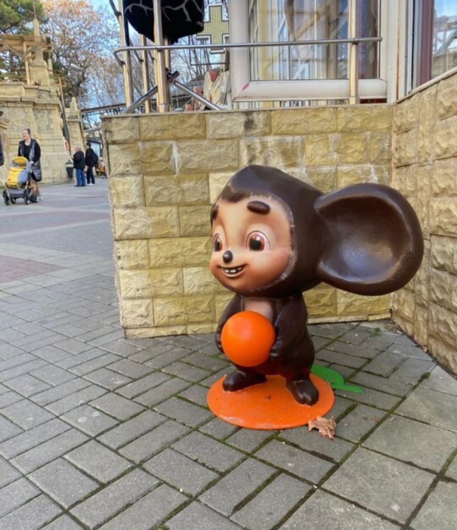 Пока я гуляла по улицам города, моё внимание привлекли Чебурашки. Они были повсюду, куда бы не повернула голову: во всех витринах магазинов, на прилавках, на картинах.