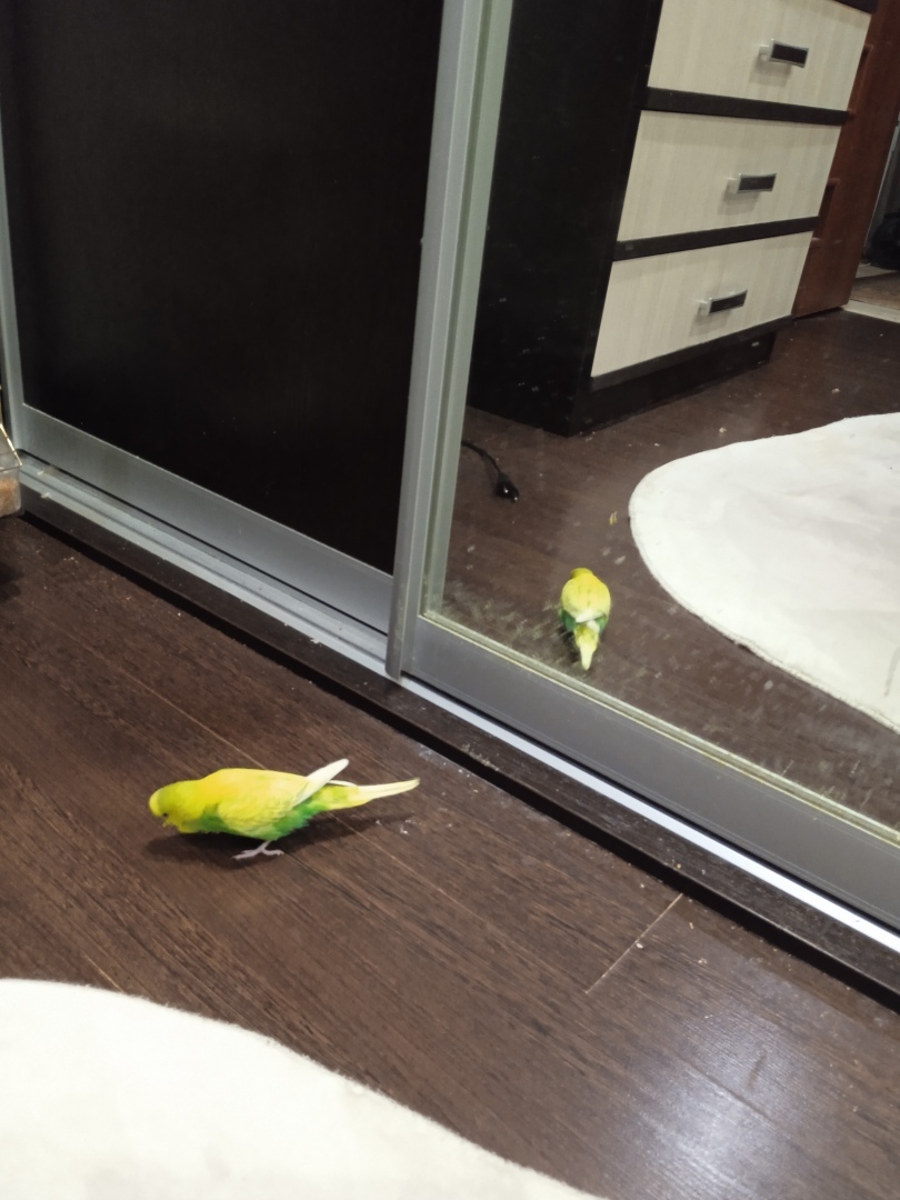 Но у попугая даже и мысли не было изучать квартиру, он сел наверх шкафа и так он сидел три — четыре месяца. На руки он не шёл боялся.У меня даже были мысли, что попугай психически не здоров. Он боялся всего. Особенно нас.