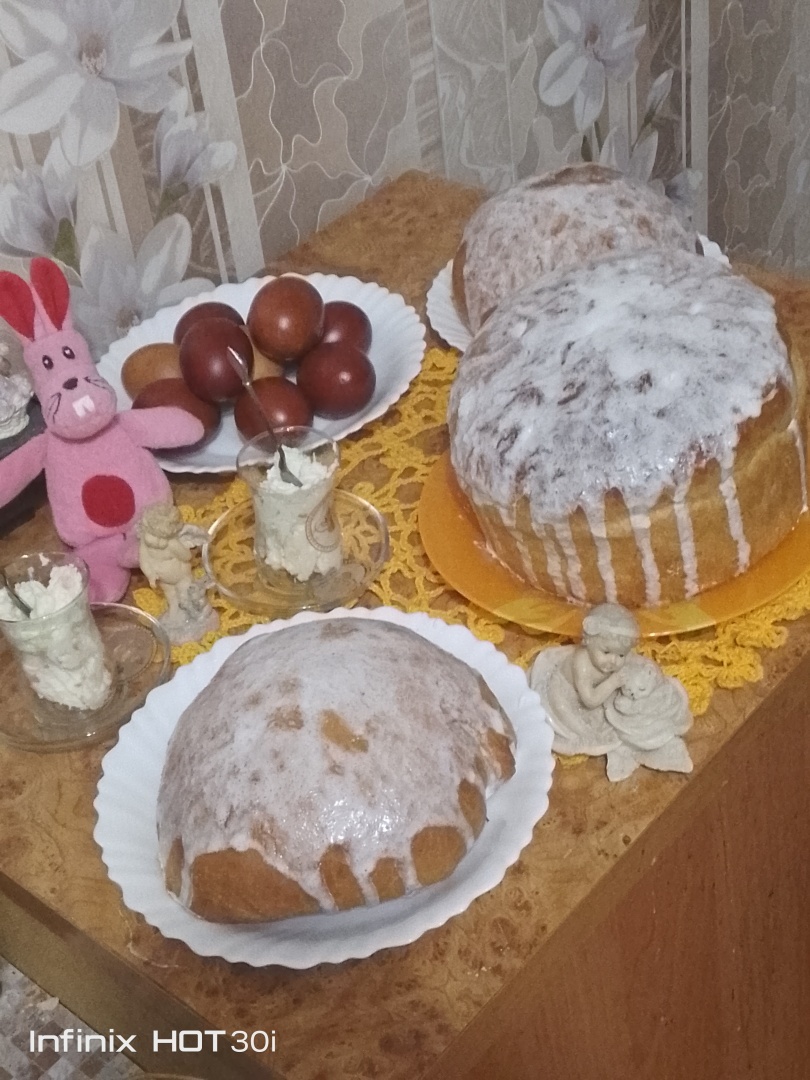 Испекла куличи, яйца покрасили на праздник Пасхи! Вместо Пасхи купили сладкую творожную массу с цукатами.