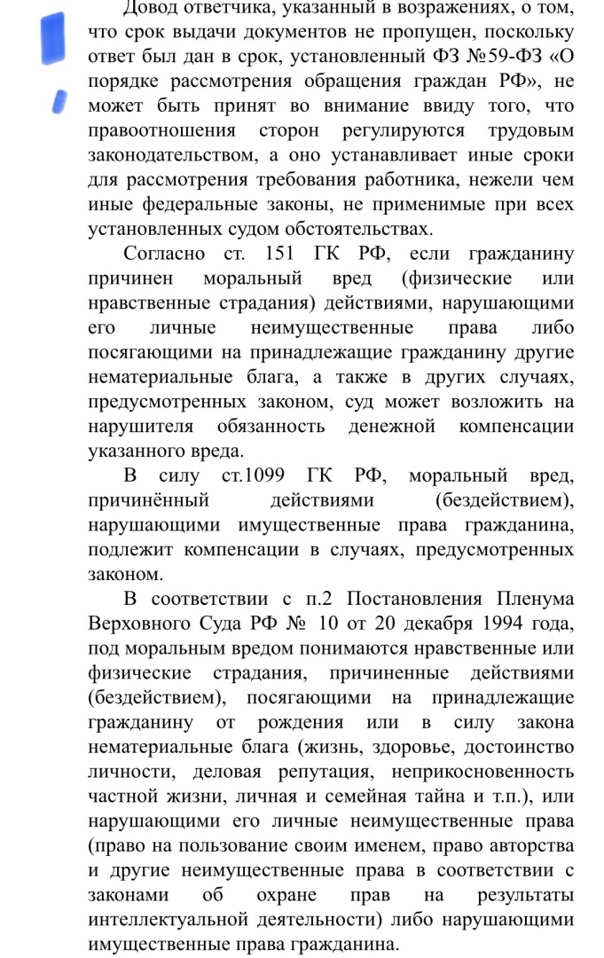 Мы просили рассмотреть исковое без нашего участия, поскольку Наташе была не приятна вся эта ситуация, в вот Ответчик возражал, и сообщил, что мол мы ответили работнику на основании ФЗ об обращениях граждан. Ха-ха. Лучше бы такие возражения вообще не подавали. ТК РФ откройте!