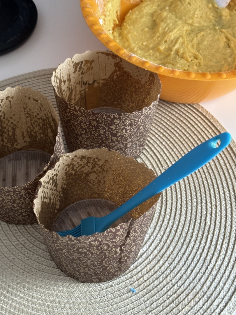 Формы для куличей смазываем маслом и заполняем их тестом на 2/3.