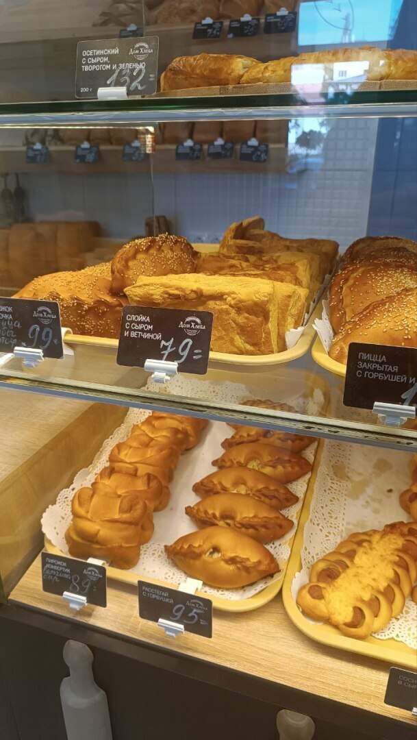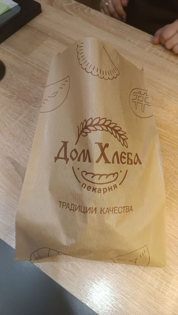 Я купила гречишный хлеб. Раньше в обычных сельских магазинах было только 2 вида хлеба: батон и черный. А сейчас, посмотрите, сколько разных видов. Даже французский батон есть. Цены чуть дороже, чем в супермаркете. Например, обычный батон стоит 57 рублей, гречишный – 75 руб. В целом, цены приемлемые для батона, который только что вышел из печи. Хлеб мне положили в бумажный брендированный пакет с названием «Дом хлеба».
