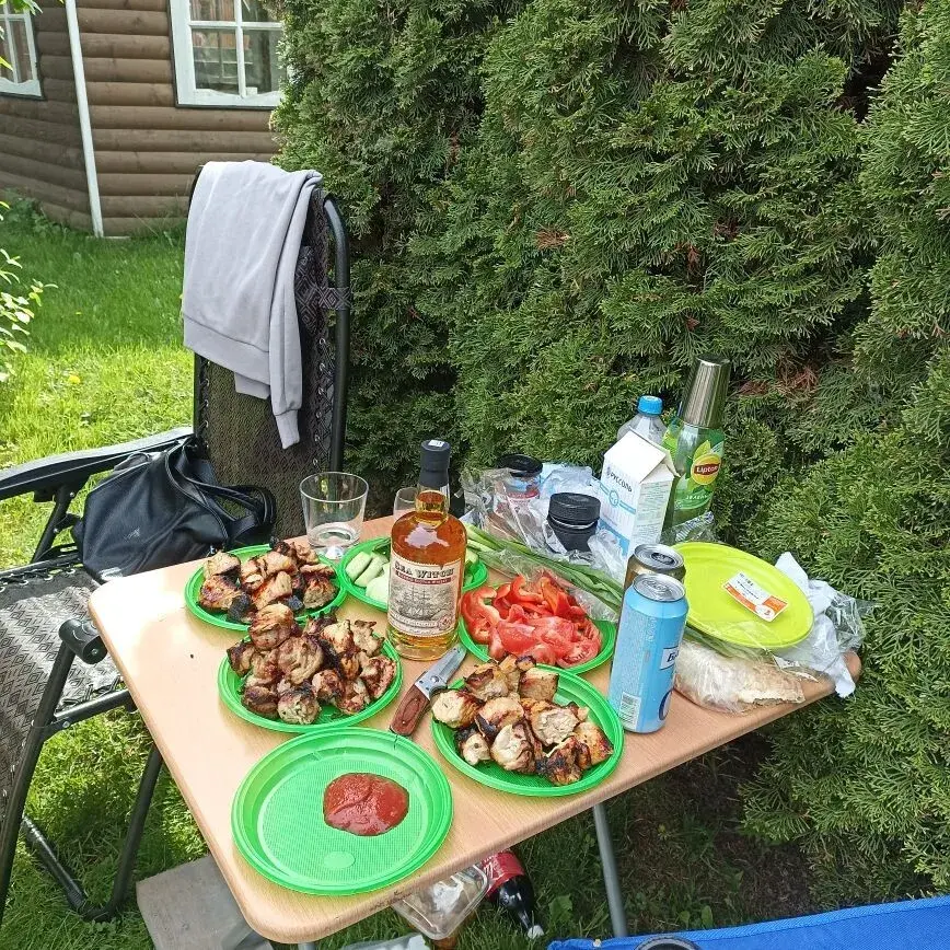 Заехали в супермаркет, затарились мясом, всякими вкусняшками. Взяли снасти и купили червей для рыбалки. Муж сестры нас уже ждал. Разжёг угли в мангале. Компания наша – всего 5 человек, но покушать все любят. Шашлыка взяли 5 кг. Естественно, за один раз весь пожарить не получилось, мангал разжигали 2 раза.