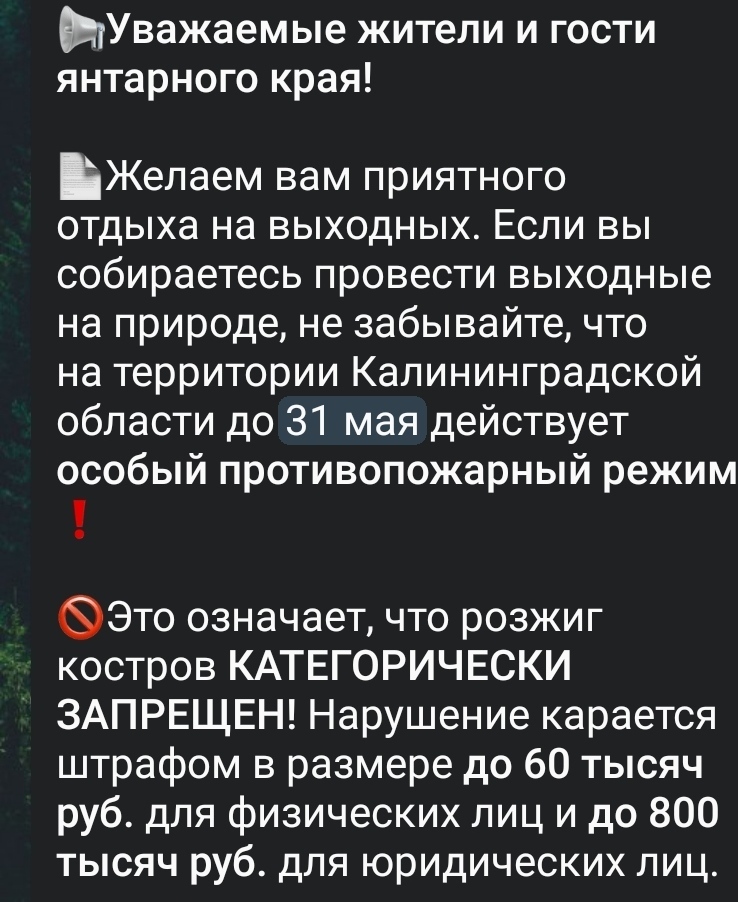 "Запрет на розжиг костров был введен временно и только в Калининградской области." - Если не заметили, то я как раз из этого региона