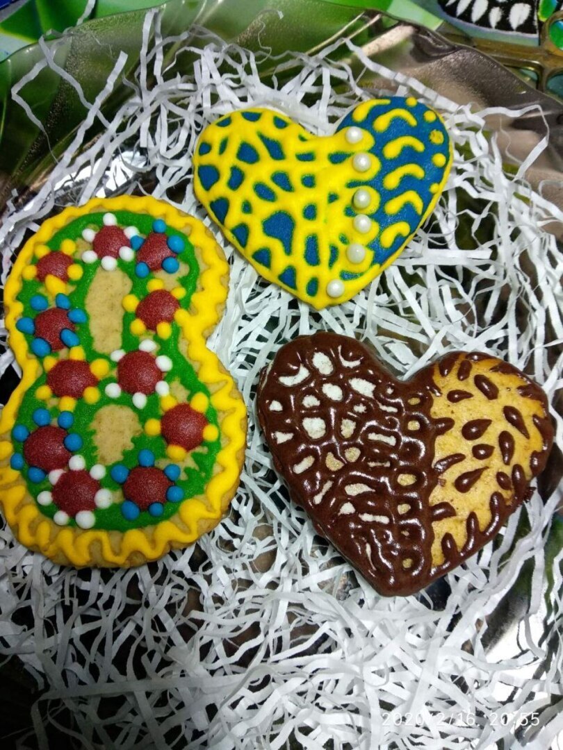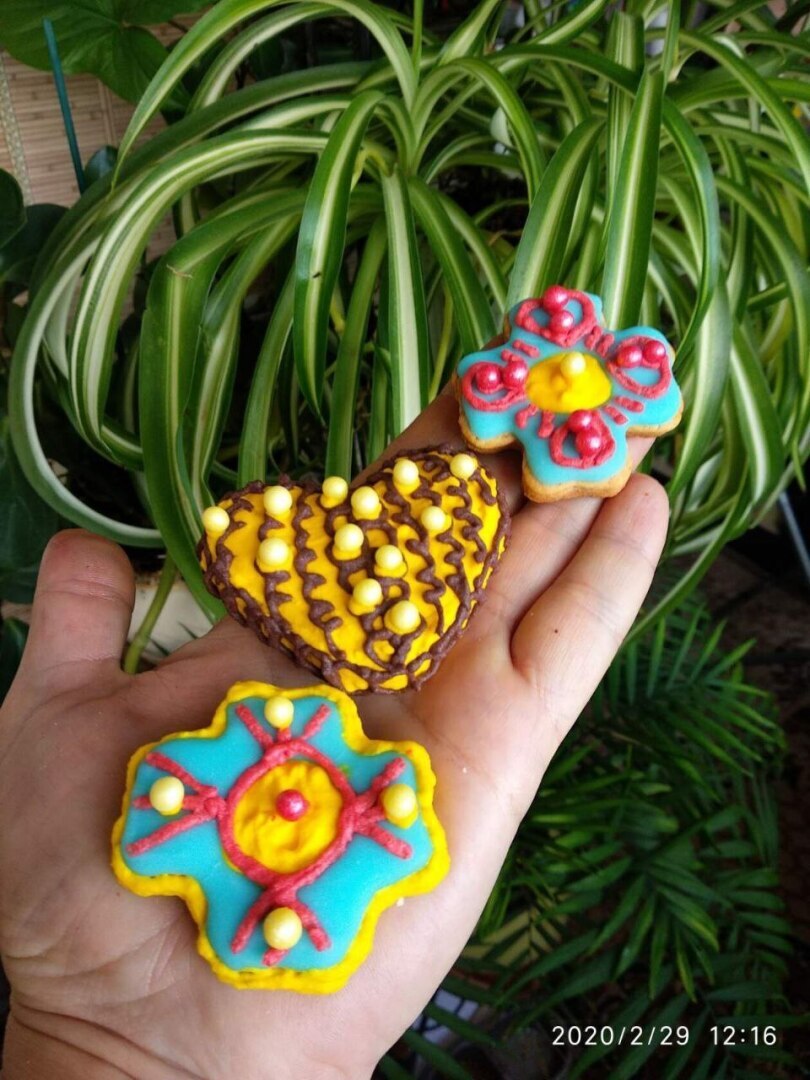 Когда выпекала по первым трем рецептам, то конечно я пробовала рисовать. Сидела и смеялась с того, что у меня получалось. Даааа, думаю, как легко это было во сне, и как трудно оказалось на деле. Тоже пришлось изучать, как правильно глазурь делать. Я думала взбила миксером и всё, готово. Ан нет…