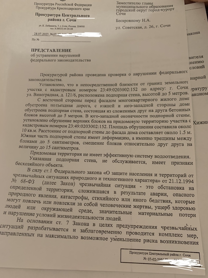 Представление со стороны прокуратуры Центрального района города Сочи, написанное зам.прокурора !!!