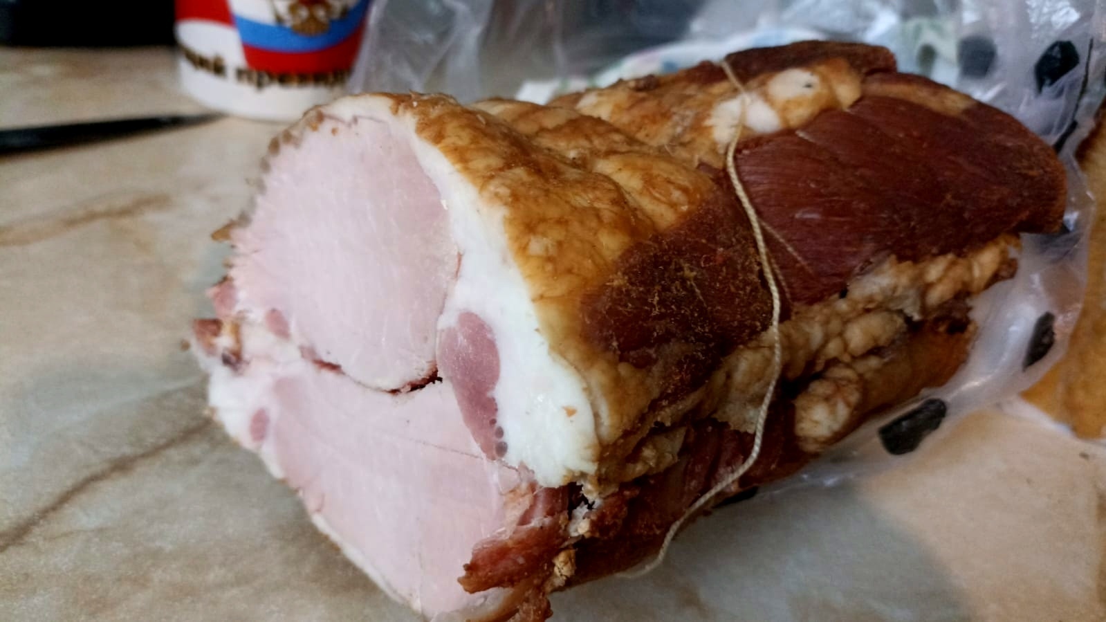 Ну а этот кусок копченного мяса тоже путешествовал вместе с клубникой и прибыл из жаркого Кыргызстана. Папа мой выростил хрюшку, заколол и сделал вот такое замечательно вкусное копченное мясо. Домашнее оно то всегда вкуснее магазинного.