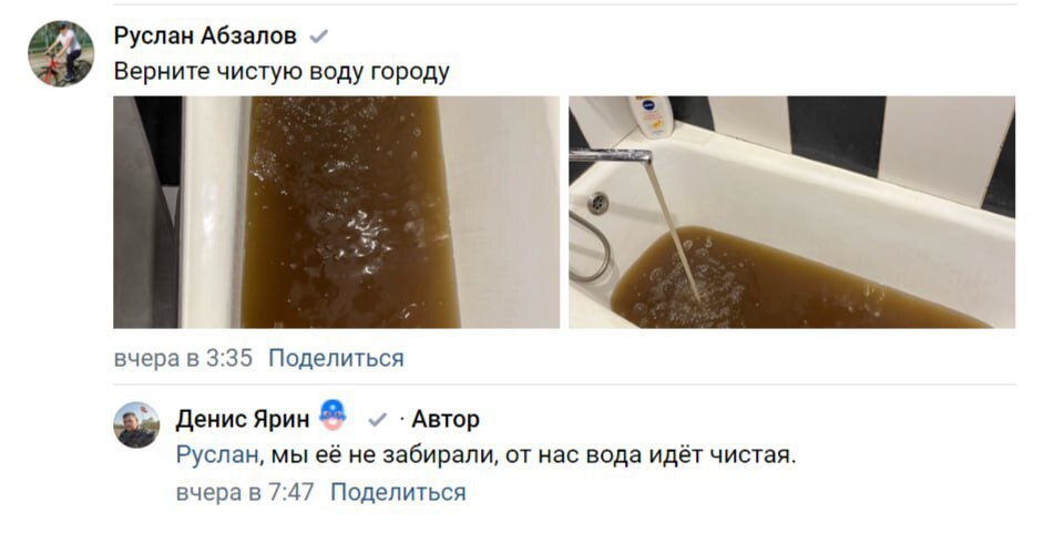 Денис Ярин назвал плаксой и пообещал «убрать» жителя, который пожаловался на грязную воду Всё началось с комментария, который первоуралец Руслан Абзалов оставил на странице Ярина. «Верните чистую воду городу», — написал он. В ответ новый директор «Водоканала» заявил следующее: «Мы ее не забирали, от нас вода идет чистая». Абзалов комментарий заскринил и опубликовал на своей странице, чем разозлил Ярина. Спустя время он отредактировал свой пост и удалил из него угрозы.