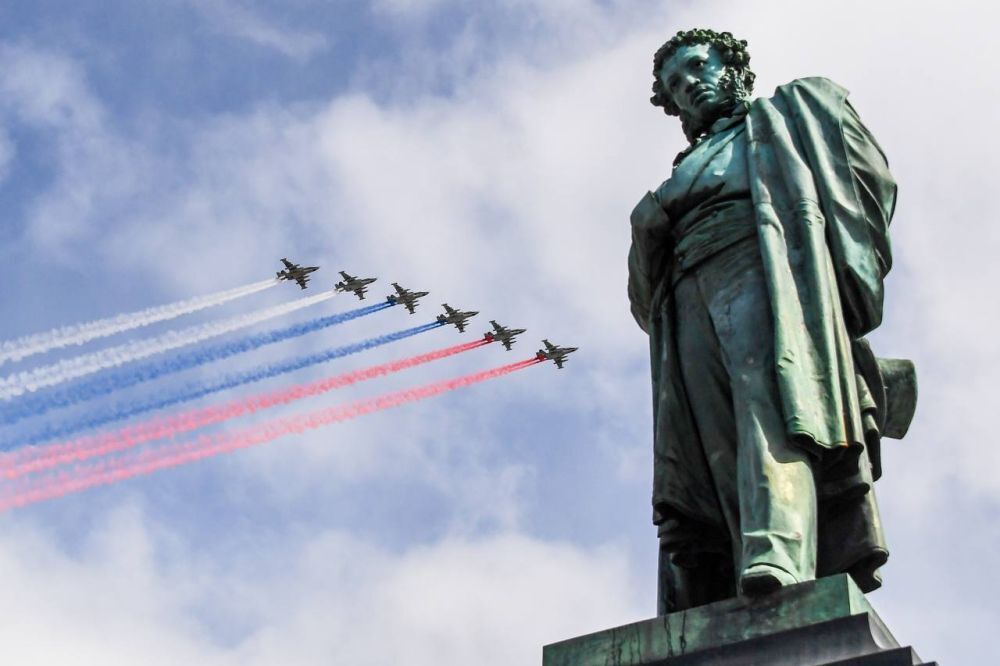 Сперва над главной площадью страны пролетело девять самолетов МиГ-29 и Су-30СМ. Ими руководил полковник Андрей Алексеев. После этого шесть штурмовиков Су-25БМ во главе с подполковником Владимиром Мордасовым раскрасили небо над Красной площадью в Москве в цвета флага России.