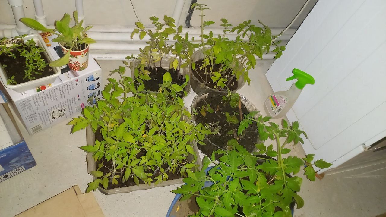 На подоконниках, на полках, на кухне, возле кроватей и стола, на полу, на полке около телевизора. Даже на потолке, так как мама растит китайский сорт огурца дома, а потом планирует тоже пересадить его в теплицу, и он уже зацвел у нее в высоту на 2 метра.
