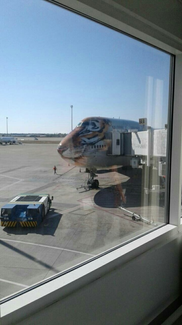 Самолёт Боинг 747-400 без ливреи тигра, ранее принадлежал авиакомпании "Трансаэро". Когда авиакомпания обонкротилась этот самолёт перешёл в авиакомпанию "Россия", где и получил такую яркую раскраску. Такая ливрея нравится не только детям, но и взрослым.