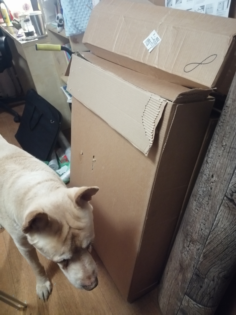 А это тот самый Пёса, ради которого мы не можем положить ламинат. Коробки с новыми кухонными шкафами.