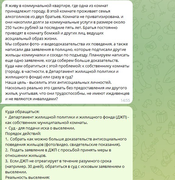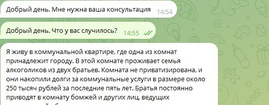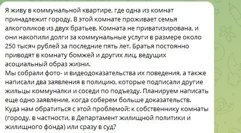 Я живу в коммунальной квартире, где одна из комнат принадлежит городу. В этой комнате проживает семья алкоголиков из двух братьев. Комната не приватизирована, и они накопили долги за коммунальные услуги в размере около 250 тысяч рублей за последние пять лет. Братья постоянно приводят в комнату бомжей и других лиц, ведущих асоциальный образ жизни.