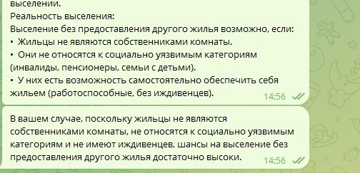 В вашем случае, поскольку жильцы не являются собственниками комнаты, не относятся к социально уязвимым категориям и не имеют иждивенцев, шансы на выселение без предоставления другого жилья достаточно высоки.