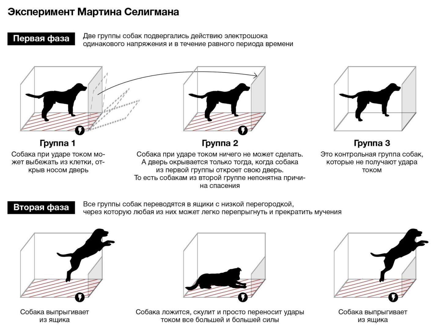 Далее всех собак поместили в клетки, поделенные на две секции, в одной из которых шла подача тока, в другой, соответственно, нет. Собаке для того, чтобы попасть в безопасный отсек клетки было необходимо преодолеть невысокий барьер, и животные из двух первых групп это успешно с этим справлялись. Однако, собаки из третьей группы, уже привыкшие к ударам тока, ложились и скулили, будучи уверенными, что от боли им никак не избежать.