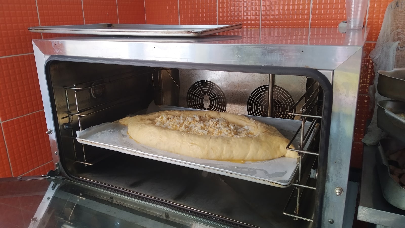 Когда печка раскалилась примерно до 180 градусов, ставим наш хачапури примерно на 15 минут. Важно чтобы было видно как идет процесс готовки