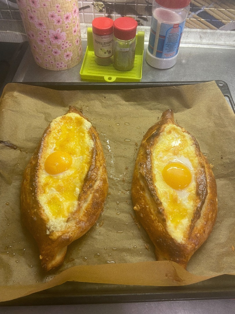Когда наш хачапури почти уже готов, осторожно достаем его и выкладываем наши желтки, предварительно сделав небольшие углубления в расплавленном сыре