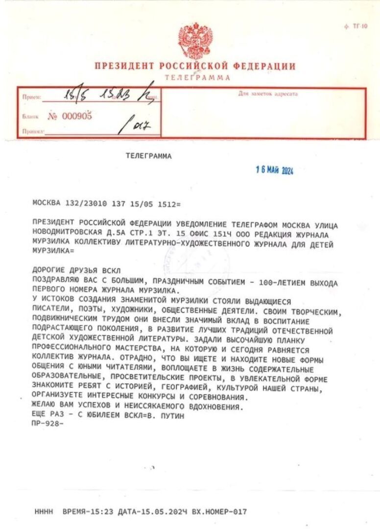 Стало известно, что сегодня редакцию "Мурзилки" поздравил Президент РФ В.В.Путин.