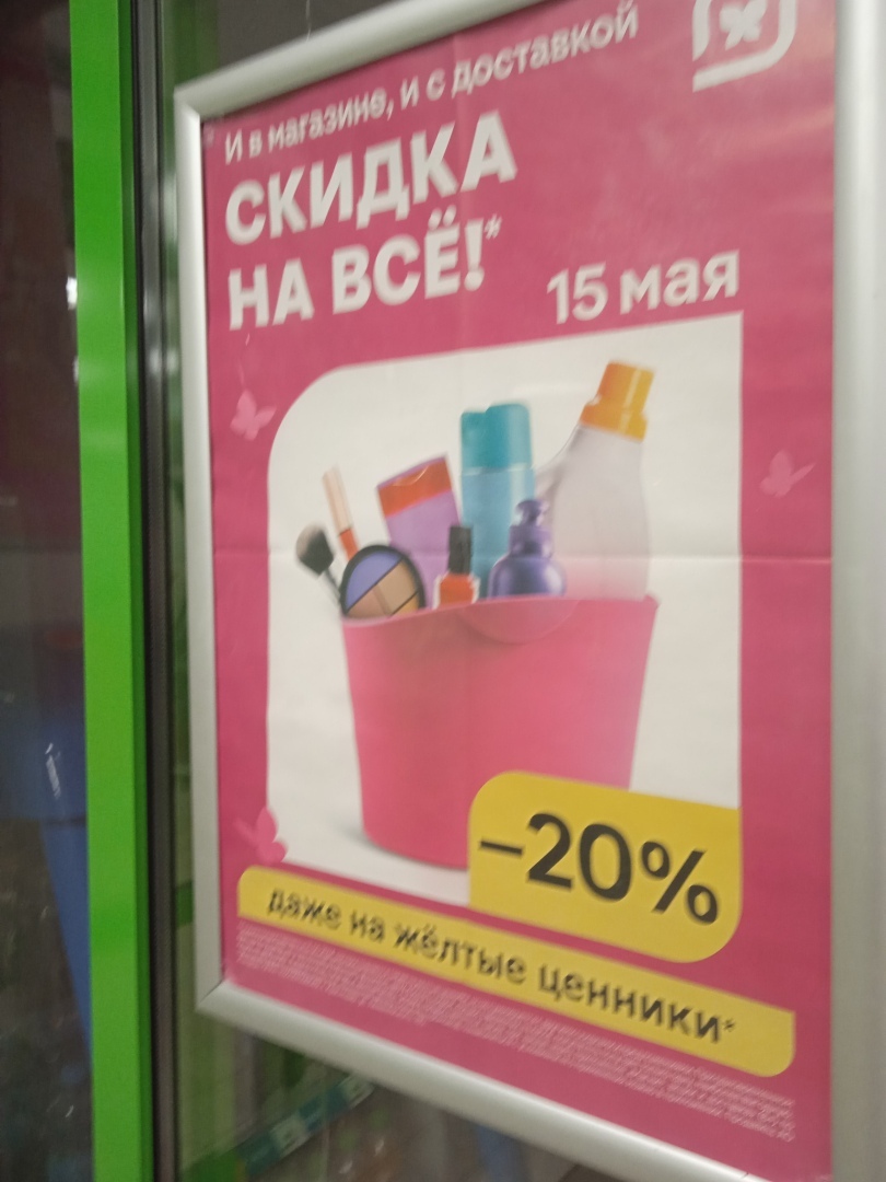 Здесь тоже акции частенько. Даже акция на акцию налагается! Это когда уже на жёлтые ценники (цена товара указана со скидкой) ещё делается скидка в 20%.