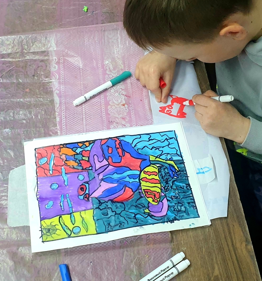 На одном из занятий знакомила ребят с витражом и витражной росписью. Долго думала, как не особо затратно, а главное безопасно провести занятие, ведь для росписи необходимо стекло.