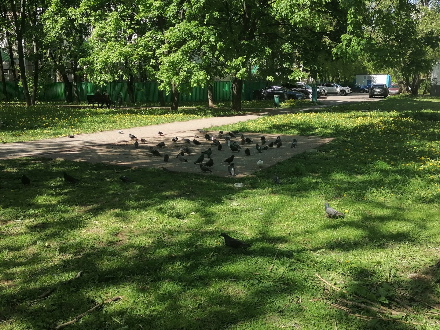 Голуби оказались очень прожорливые и съели почти все наши бутерброды.), оставив нам лишь колбасу и немного сыра. Но мы особо не расстроились так как смотреть на важных кушающих птичек было одно удовольствие. Да и после зимы парк действительно преобразился, все вокруг стало зелёным, трава, деревья, кустарники и цветы. И просто огромное количество одуванчиков, везде жёлтые пятнышки на зелёном фоне.
