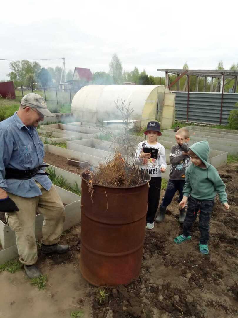 Потом вместе с малышнёй собрали и сожгли в бочке сухие листья и ветки. На этом этапе внуки устали, поэтому больше смотрели и фотографировали.