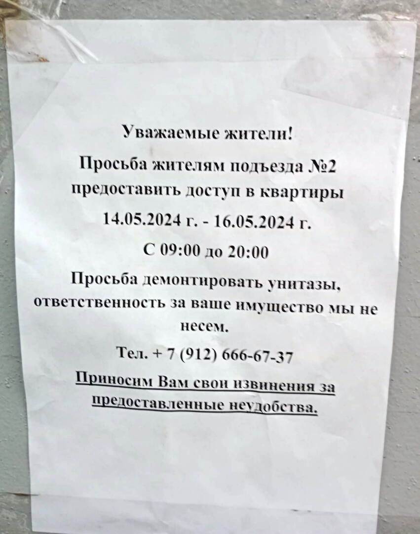 После всего выше перечисленного вывесили объявление на всех подъездах, что все жильцы дома, за свой счёт должны демонтировать унитазы во время замены труб водоотведения в их подъезде.