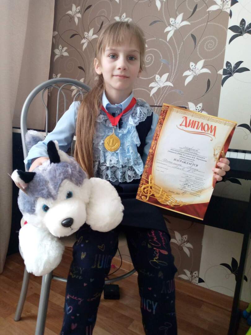 Она получила свой первый диплом, если не считать виртуальных дипломов на uchi.ru, и свою первую золотую медаль! С ней потом не расставалась и даже пошла с ней в школу, чтобы все одноклассники знали, кто их подруга! Дома Аленушку ждал небольшой сюрприз в виде плюшевой собаки!