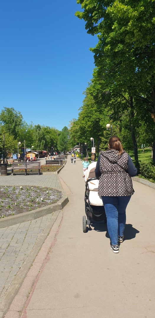 На обратном пути детки захотели на аттракционы. В парке их не много, не большое колесо обозрения, старое, все скрипит, кататься страшновато, да и деревья уже выше этого колеса и смысла на него идти нет, весь вид на Волгу закрыт. Ещё есть разные качели, тоже старые и скрипят, даже вид не красивый, вся краска слезла, все серо-грязное...на такие, конечно, развлечения мы не пошли, да и внимание детей они не привлекли. А вот на поезд детский и батуты ребятишки побежали с удовольствием. (Фото/видео нет, сел телефон😄)