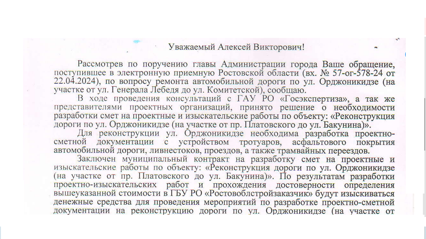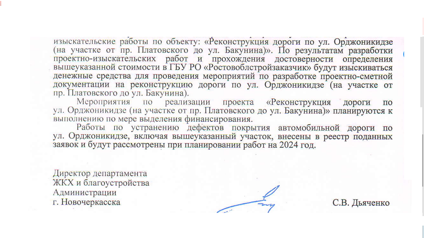 Пришел положительный ответ на моё обращение. Глава Администрации Новочеркасска дал поручение на составление сметных документов, проектов и так далее, чтобы провести ямочный ремонт проезжей части дороги.