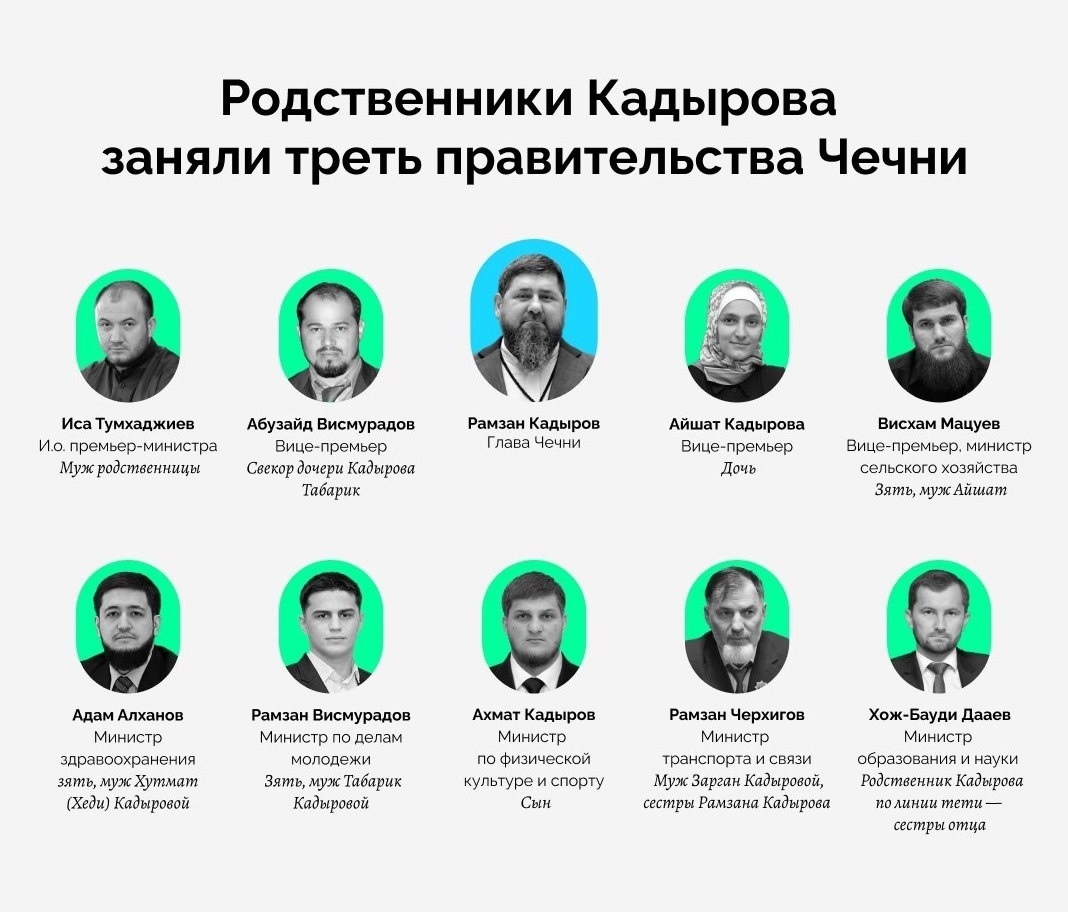 Родственники главы Чеченской Республики занимают девять из 23 постов в правительстве. Во вторник новым исполняющим обязанности премьера стал Иса Тумхаджиев, который является зятем и родственником Рамзана Кадырова. Его старший сын Ахмат (18 лет) назначен министром физической культуры и спорта. На должность министра по делам молодежи был назначен Табарик Кадырова Рамзана Висмурадов (20 лет), муж четвертой дочери главы республики.