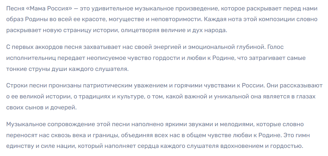 3 мая 2024 года состоялась премьера песни с громким названием "Мама Россия", в которой (я так и не поняла!) поётся не то о маме, не то о дочке. Не знаю, кто автор этого "высокохудожественного" текста, но что это просто какой-то набор слов, вполне очевидно.