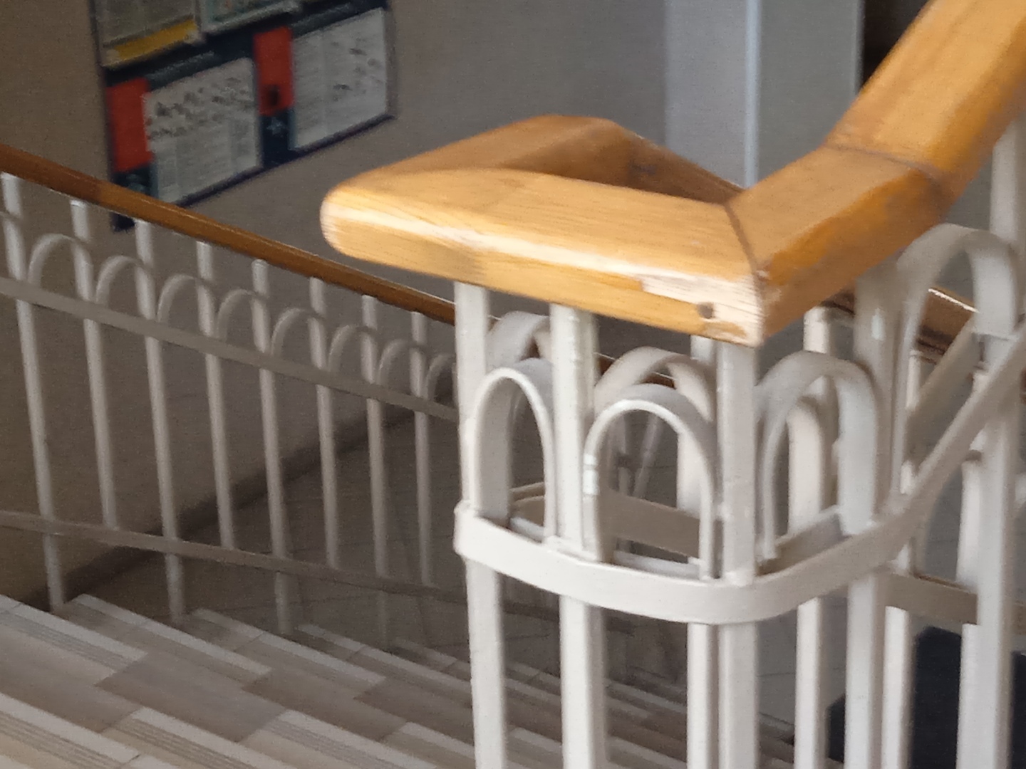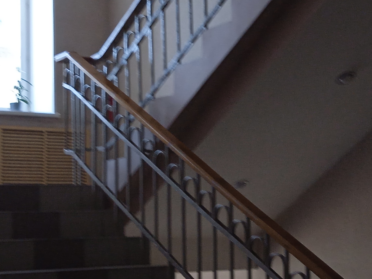 При входе в здании – широкая лестница, которая в междуэтажье расходится направо и налево.