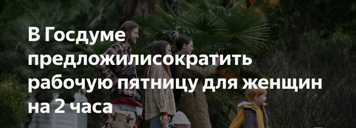 Если бы как в Египте, где женщины работают на государство до обеда; а далее - работают на семью дома... Но то - Египет, а у нас, прям вижу, как закрываются школы, д.сады и поликлиники, т.к. женщин стали раньше отпускать с работы по замыслам депутата.