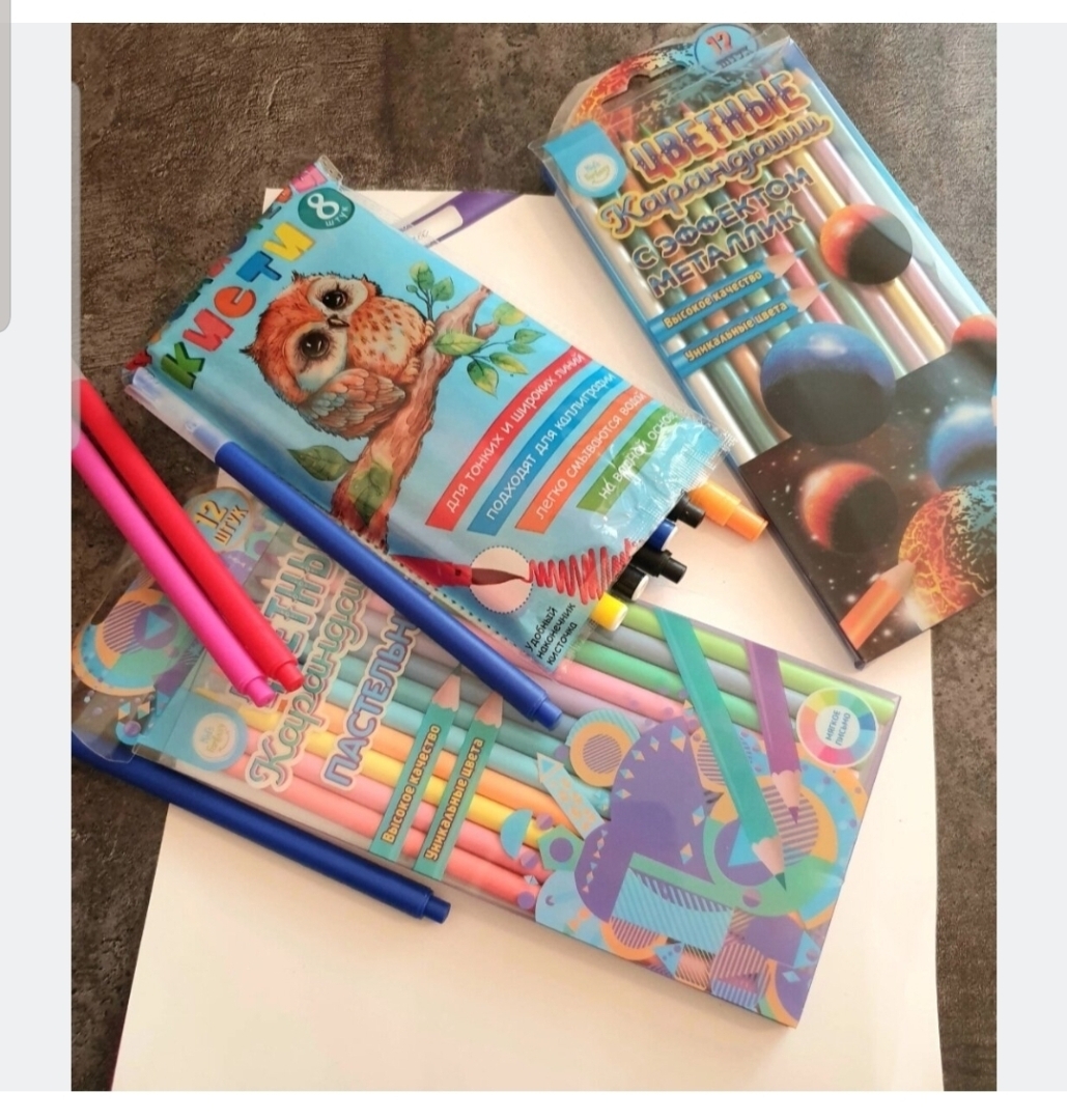 Карандаши там беру,черные гелевые ручки и разные наборы для творчества,нож для резьбы по дереву очень удобно использовать при заточке карандашей,фломастеры-кисти довольно не плохи)