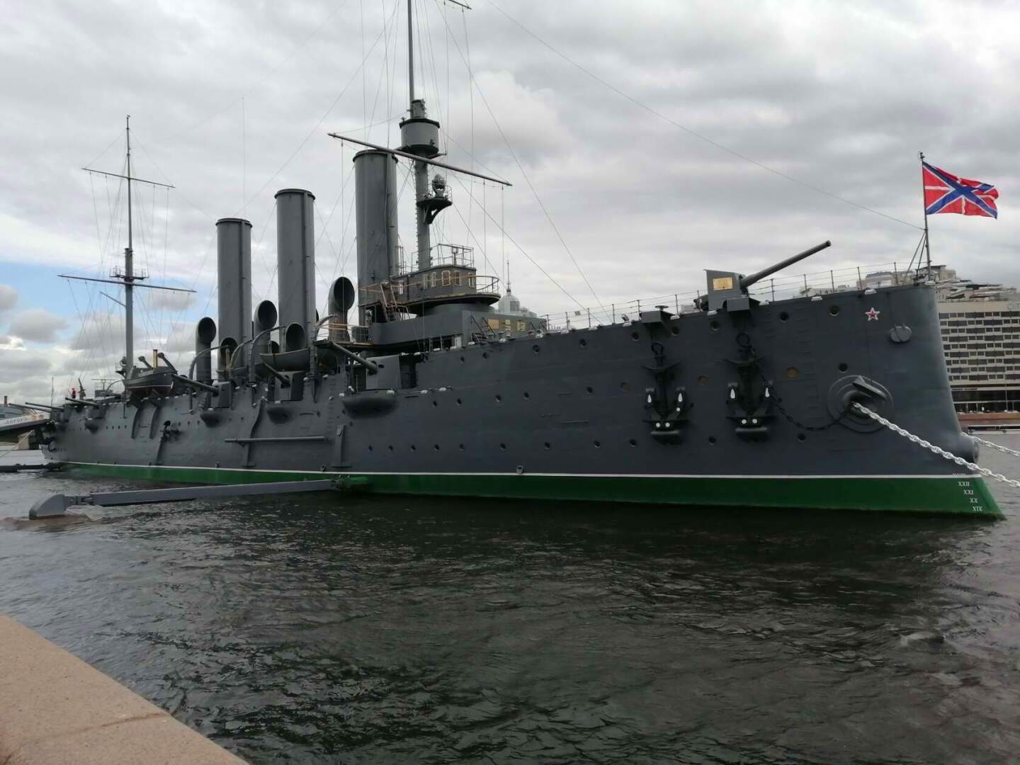 Побывали мы и возле знаменитого крейсера "Аврора" — одного из символов революции. Теперь он на "вечной стоянке", на его борту размещена музейная экспозиция, посвящённая трём войнам, в которых он участвовал.