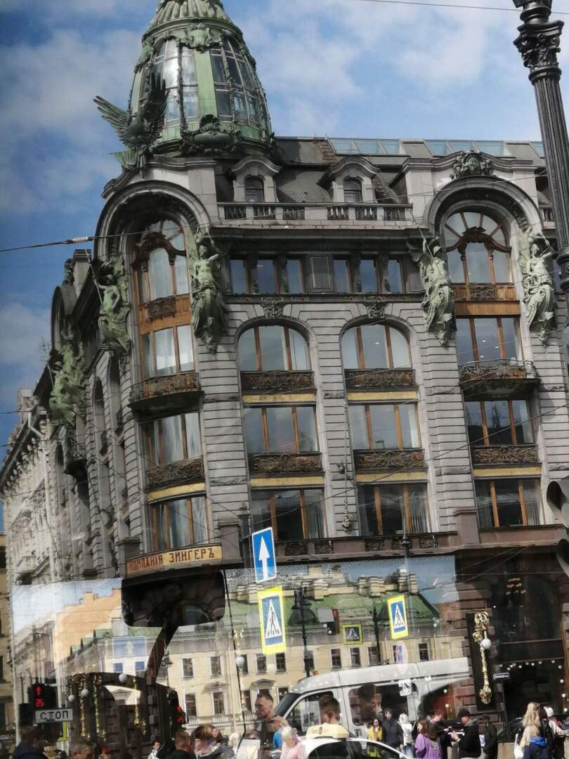 Ещё одно великолепное историческое здание на Невском, которое привлекло наше внимание — это дом Зингера. Здесь в начале XX века было предприятие по производству швейных машин. Фасады здания очень необычно оформлены: стены выложены красным и серым гранитом, оформлены кованой бронзой. Но самое привлекательное зрелище, конечно же, скульптуры! Говорят, на реставрацию этого дома, которую в начале 2000-х провели снаружи и внутри, потратили более 1 миллиарда рублей.