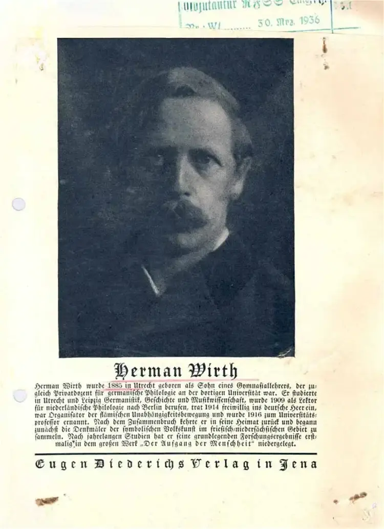 В то время как Вирт изо всех сил пытался быть принятым в академические круги Германии, будучи соучредителем Studiengesellschaft für Geistesurgeschichte «Deutsches Ahnenerbe», он временно стал видным нацистским ученым. Вскоре он начал просматривать тексты о германской предыстории, мифологии и фольклоре, надеясь собрать безошибочные доказательства своих диковинных теорий об арийской расе, ее древней истории и религии.