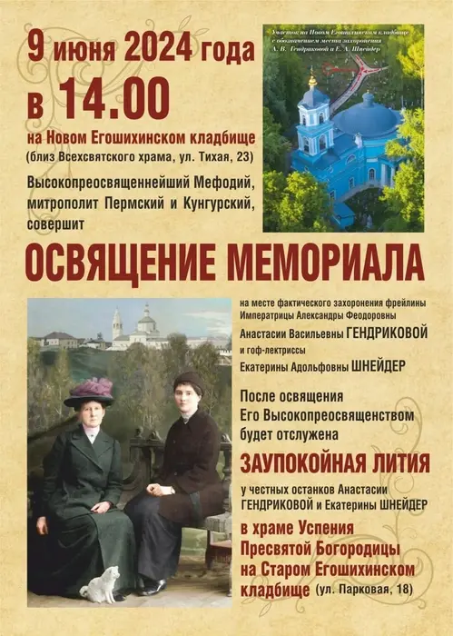 9 июня состоится освящение мест фактического захоронения Анастасии Гендриковой и Екатерины Шнейдер.