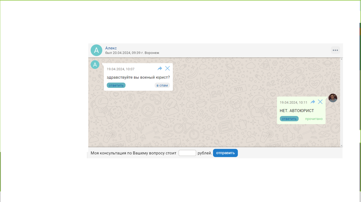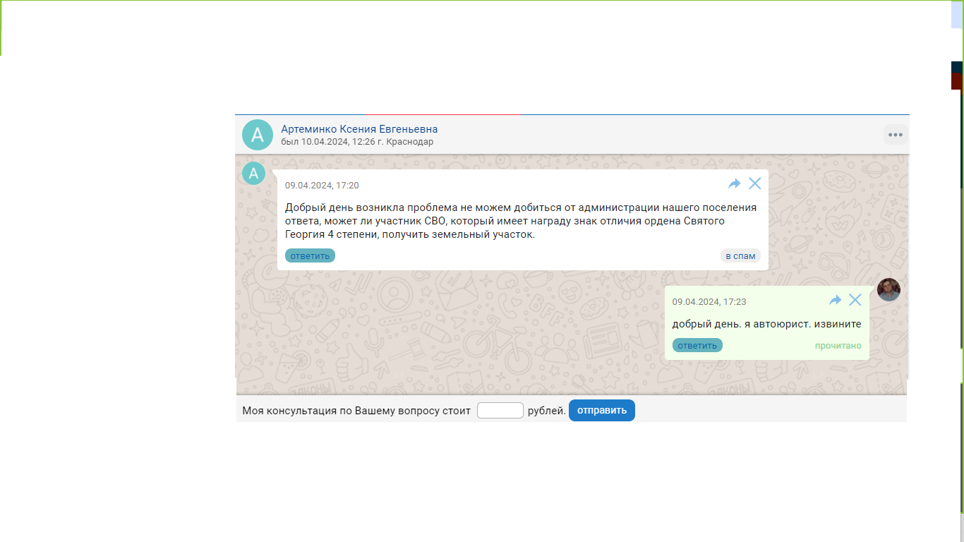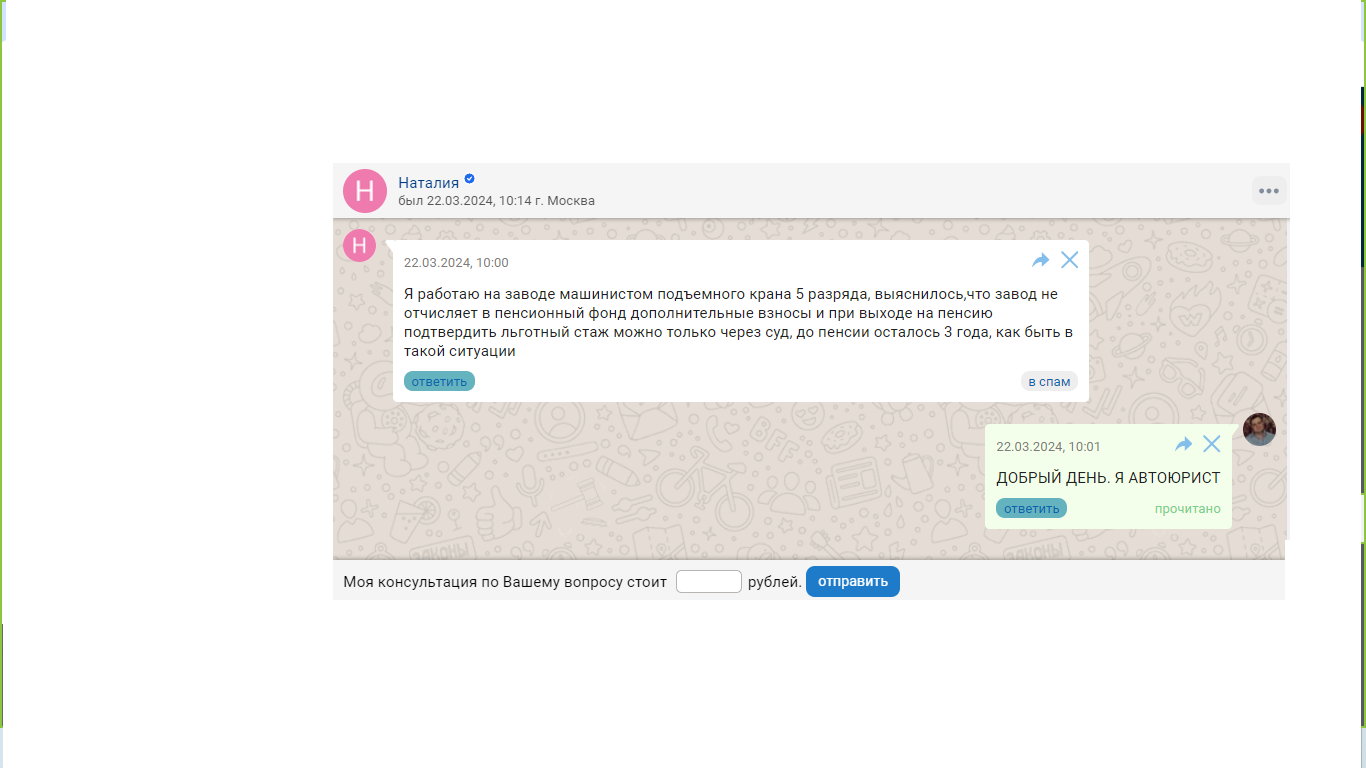 Если в личку пишут, просят консультацию, допустим мне с просьбой помочь в вопросе госзакупок, а я просто понимаю, что это не моя «тема», я отправляю эту заявку на «биржу» из чата другому свободному юристу)