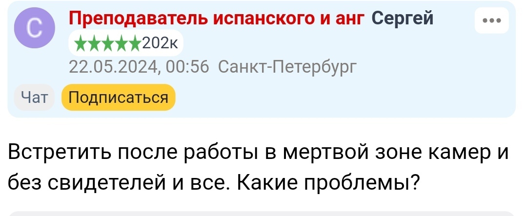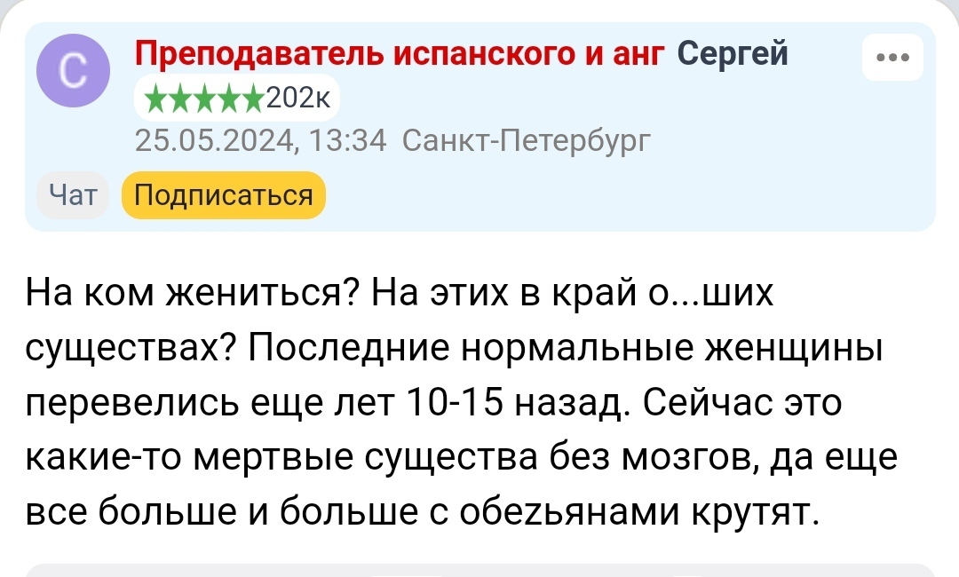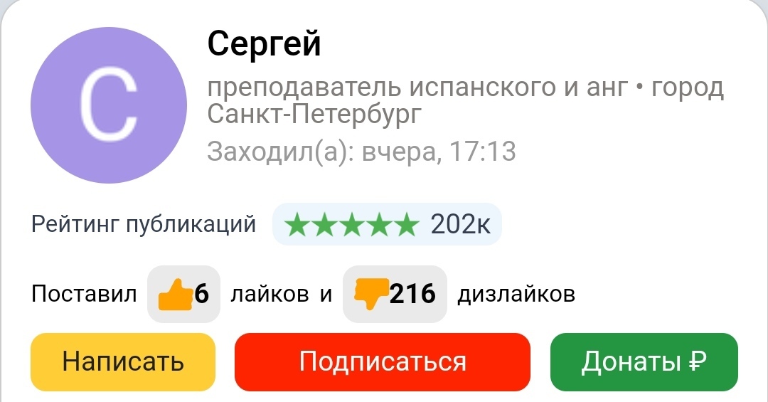 Познакомтесь с любителем ставить дизлайки Сергеем из Санкт - Петербурга. Он преподаватель испанского и английского языка. То есть взрослый человек, но впал в детство, судя по тому , как он "штампует" под моим любым видео дизлайки. Стоит мне выложить любое видео , сразу он ставит свой очередной дизлайк. Не знаю, зачем это он делает, ибо на сколько я знаю , дизлайк,ни лайк ни на что не влияет( ни на рейтинг, ни на заработок).На рейтинг и на заработок влияет прежде всего активность: выставлять контент, писать статьи, ставить лайки(если этого заслуживает статья или контент), комментарии. И лайк, и дизлайк расценивается одинаково.Больше всего расценивается комментарий. Сергей из Санкт- Петербурга, о котором написано в этом комментарии, помимо того, что он любитель дизлайков, он еще и любитель давать негативные советы. В прикрепленных скринах доказательство его негативных советов. Сразу скажу, Сергея я не знаю в реальной жизни и в виртуальной жизни не знала бы , если бы он не отличился бы своими ежедневными преследованиями с дизлайками и негативными советами для других. Кроме того он в своих советах оскорбляет женщин.