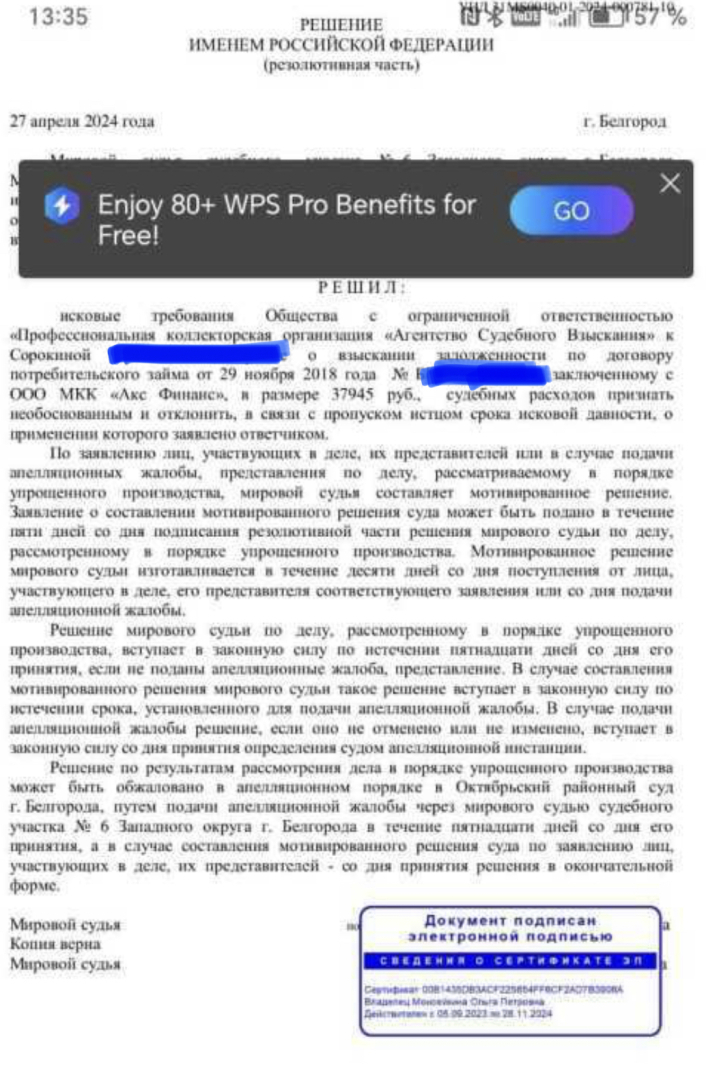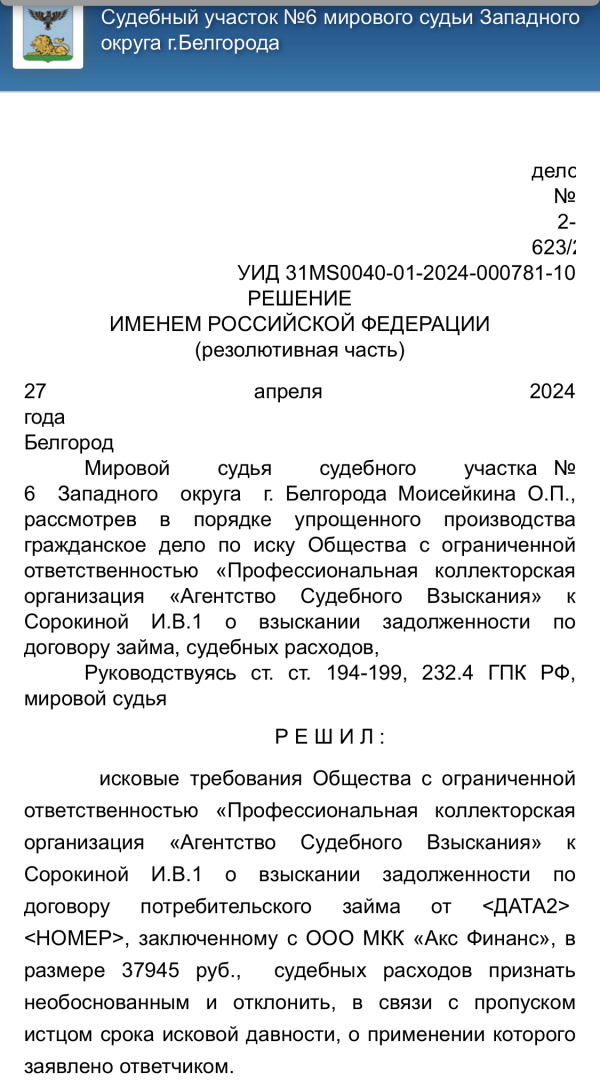 Решение суда вступило в законную силу (по материалам гражданского дела 2-623/2024/6 судебный участок номер 6 Западного округа Белгорода).