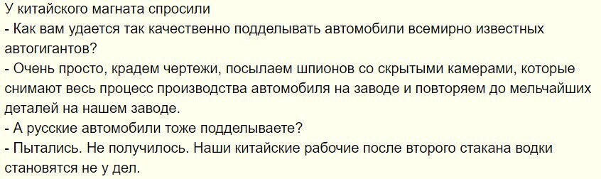 Все так ! все так! А теперь не анек а быль На одном из китайских заводов, производящих автобусы работал мой коллега. Техническим консультантом целого очень Главного Конструктора. И надо же было случится незадаче, у коллеги случился отпуск.