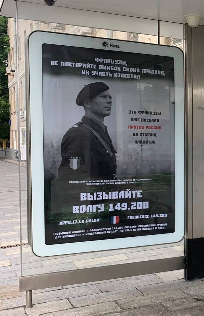 В Москве возле посольства Франции на автобусных остановках появились новые плакаты. На них изображен командир дивизии СС «Шарлемань» Эдгар Пюо, которого в 1945 уничтожили советские войска.