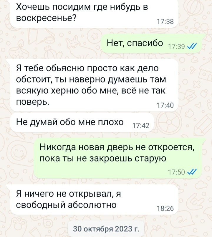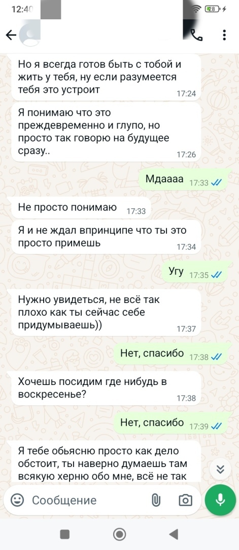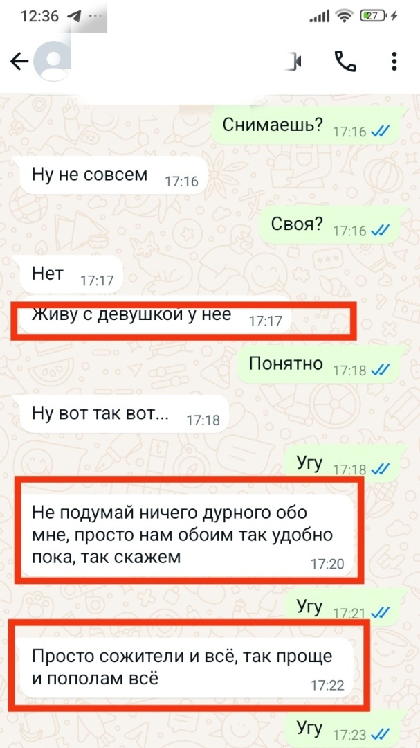 Мне было интересно знает ли его девушка, что она для него просто сожитель, потому что так удобно... Или девушки нет вовсе? Может жена? Пока я строила разные догадки, неумелый альфонс дальше продолжал вести свою неумелую игру, писать какие-то оправдания своему поандению и проч, и проч...