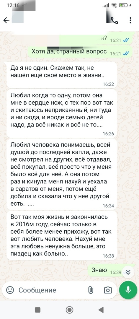 А собеседник начал лить в мои уши грустную историю о несчастной любви и предательстве, в надежде на то, что моë доброе (читай - бабское))) сердце дрогнет и пожалеет мальчоночку, прогрев его на своей груди, (паскуду белобрысую)))