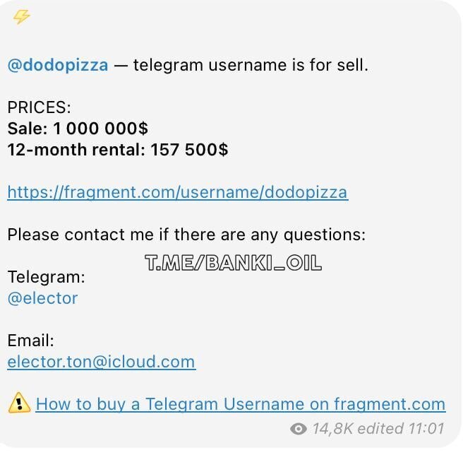 "«Додо Пицца» будет судиться с Telegram из-за юзернейма dodopizza. Руководство мессенджера позволило пользователям покупать любые юзернеймы, и теперь владелец канала dodopizza продаёт его за $1 млн. Сеть пиццерий хочет отобрать имя пользователя через суд."