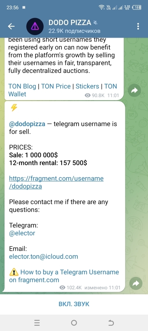 "«Додо Пицца» будет судиться с Telegram из-за юзернейма dodopizza. Руководство мессенджера позволило пользователям покупать любые юзернеймы, и теперь владелец канала dodopizza продаёт его за $1 млн. Сеть пиццерий хочет отобрать имя пользователя через суд."
