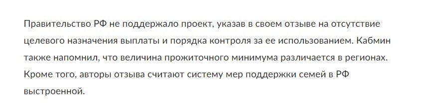 Буквально недавно стало известно, что Правительство инициативу не поддержало: так как не определено целевое назначение выплаты и нет обоснования, почему платить нужно именно указанную сумму.
