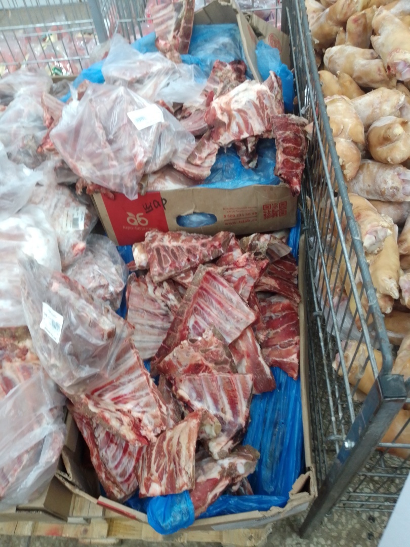В Светофоре свинина 300 с чем-то рублей. В других более солидных около 500 рублей. В этот раз постелили чистые подложки хоть под мясо, до этого было страшно взглянуть.